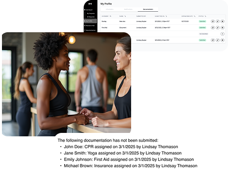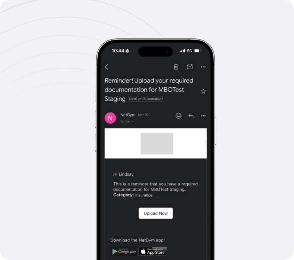 Tired of chasing and manually organizing staff credentials during hiring, onboarding, and ongoing employment? Collect, track, and store critical documents—like CPR certifications, insurance, and training qualifications—right inside NetGym. Reduce your workload and gain peace of mind knowing all essential employment documentation has been collected and renewal reminders are in place.